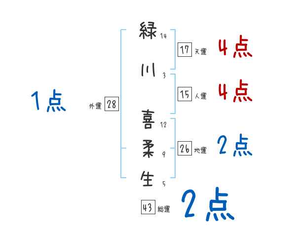 総運![]() | 緑川喜柔生さんの総運は43画の2つ星!頑固な性格で独立心が強いかも。やや非現実的で浪費に注意しましょう。 あなたの人生を表す1番重要な運勢です。生涯を通じて影響する総合運となり、主に50歳以降の晩年期に影響を及ぼします。 |