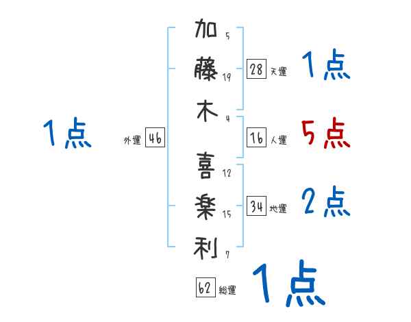 天運![]() | 加藤木喜楽利さんの天運は28画の1つ星!家庭環境に注意。スポーツで活躍できる能力があるかも。 家系が持つ宿命的な運勢を表します。祖先から受け継いだ苗字ですので自分の力が及びません。家柄を象徴します。 |