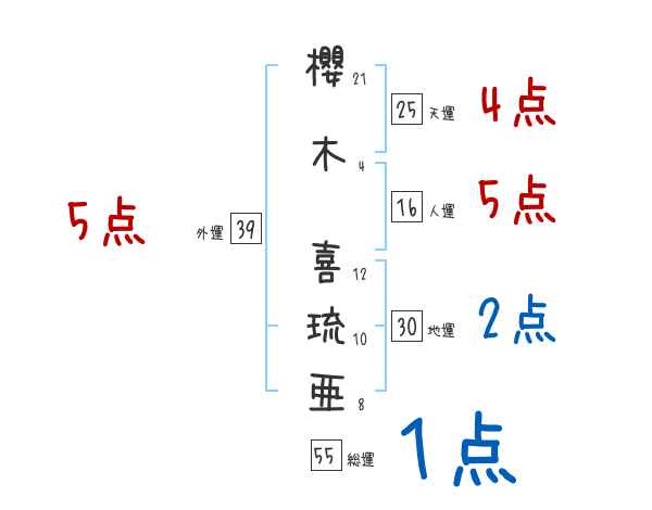 外運![]() | 櫻木喜琉亜さんの外運は39画の5つ星!社交性に優れ人望が厚い。人の上に立ち成功する。 生活面を象徴する運勢です。外部から受ける影響力を表し、結婚運、家庭運や職場、環境への順応性を表します。 |