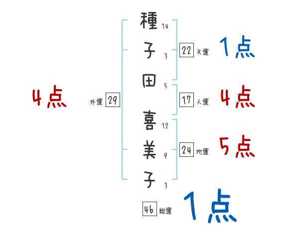 外運![]() | 種子田喜美子さんの外運は29画の4つ星!完全主義で才能がある。厳格な心の持ち主。 生活面を象徴する運勢です。外部から受ける影響力を表し、結婚運、家庭運や職場、環境への順応性を表します。 |
