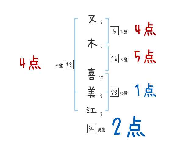 人運![]() | 又木喜美江さんの人運は16画の5つ星!人望が厚く大きく発展する。逆転成功が見える。 性格や才能などを表す2番目に重要な運勢です。人間関係や協調性、社会的な成功に影響します。主に20歳から50歳ぐらいまでの中年期の運勢を表します。 |