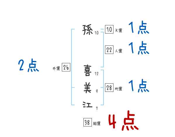 外運![]() | 孫喜美江さんの外運は26画の2つ星!波瀾万丈かも。信頼できる人を大事にしましょう。 生活面を象徴する運勢です。外部から受ける影響力を表し、結婚運、家庭運や職場、環境への順応性を表します。 |