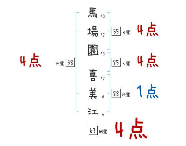 天運![]() | 馬場園喜美江さんの天運は35画の4つ星!温厚な性格で感受性が高い。穏和な性格で人望が厚い。 家系が持つ宿命的な運勢を表します。祖先から受け継いだ苗字ですので自分の力が及びません。家柄を象徴します。 |