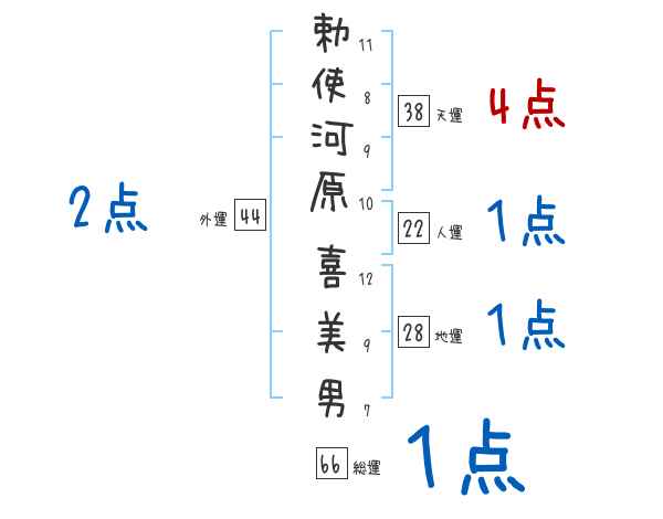 外運![]() | 勅使河原喜美男さんの外運は44画の2つ星!誠実で慎重な性格。物事を考えすぎないように注意しましょう。 生活面を象徴する運勢です。外部から受ける影響力を表し、結婚運、家庭運や職場、環境への順応性を表します。 |
