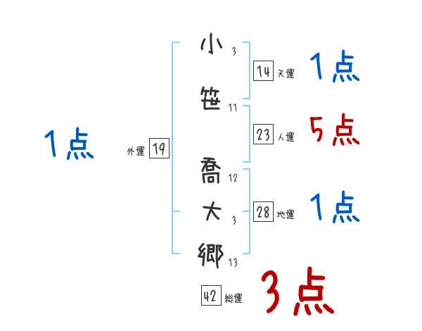 天運![]() | 小笹喬大郷さんの天運は14画の1つ星!人に対して優しいがストレスを溜め込みがち。人間関係のトラブルを避けるよう気をつけましょう。 家系が持つ宿命的な運勢を表します。祖先から受け継いだ苗字ですので自分の力が及びません。家柄を象徴します。 |