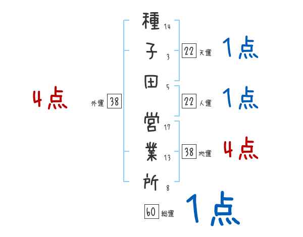 天運![]() | 種子田営業所さんの天運は22画の1つ星!努力することが苦手ないっぽう手先が器用。芸術性にも優れる。 家系が持つ宿命的な運勢を表します。祖先から受け継いだ苗字ですので自分の力が及びません。家柄を象徴します。 |