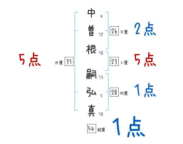 人運![]() | 中曽根嗣弘真さんの人運は23画の5つ星!想像力に優れ活力がある。一代で成功し名誉を手に入れる。 性格や才能などを表す2番目に重要な運勢です。人間関係や協調性、社会的な成功に影響します。主に20歳から50歳ぐらいまでの中年期の運勢を表します。 |