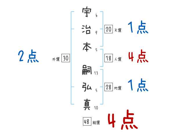 外運![]() | 宇治本嗣弘真さんの外運は30画の2つ星!浮き沈みの激しさに注意しましょう。 生活面を象徴する運勢です。外部から受ける影響力を表し、結婚運、家庭運や職場、環境への順応性を表します。 |