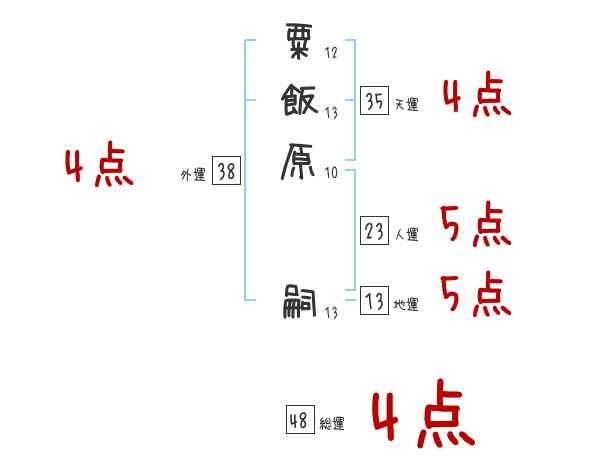 人運![]() | 粟飯原嗣さんの人運は23画の5つ星!想像力に優れ活力がある。一代で成功し名誉を手に入れる。 性格や才能などを表す2番目に重要な運勢です。人間関係や協調性、社会的な成功に影響します。主に20歳から50歳ぐらいまでの中年期の運勢を表します。 |