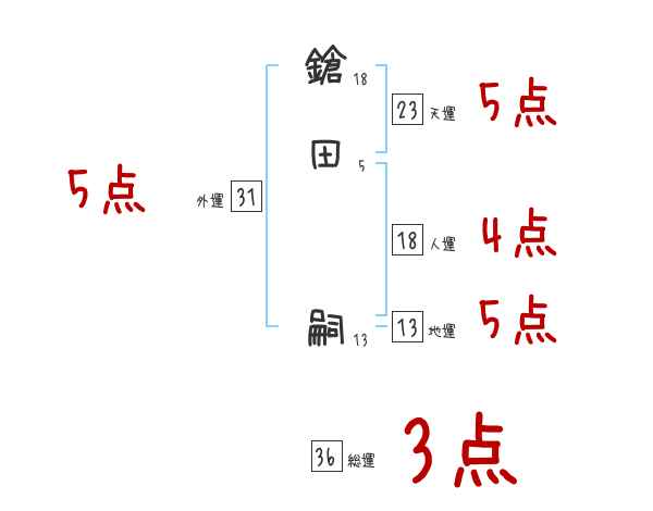 天運![]() | 鎗田嗣さんの天運は23画の5つ星!想像力に優れ活力がある。一代で成功し名誉を手に入れる。 家系が持つ宿命的な運勢を表します。祖先から受け継いだ苗字ですので自分の力が及びません。家柄を象徴します。 |