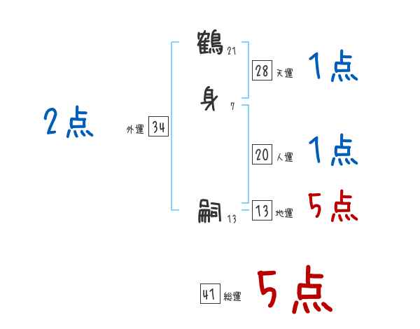 天運![]() | 鶴身嗣さんの天運は28画の1つ星!家庭環境に注意。スポーツで活躍できる能力があるかも。 家系が持つ宿命的な運勢を表します。祖先から受け継いだ苗字ですので自分の力が及びません。家柄を象徴します。 |