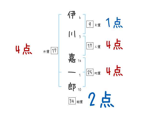 外運![]() | 伊川嘉一郎さんの外運は17画の4つ星!積極的な行動力。地位を気づき財産を手に入れる。純粋な心と直感力。 生活面を象徴する運勢です。外部から受ける影響力を表し、結婚運、家庭運や職場、環境への順応性を表します。 |