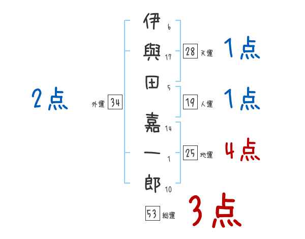 総運![]() | 伊與田嘉一郎さんの総運は53画の3つ星!やや見栄っ張りで虚栄心がある。散財に注意。 あなたの人生を表す1番重要な運勢です。生涯を通じて影響する総合運となり、主に50歳以降の晩年期に影響を及ぼします。 |