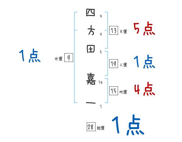 総運![]() | 四方田嘉一さんの総運は28画の1つ星!家庭環境に注意。スポーツで活躍できる能力があるかも。 あなたの人生を表す1番重要な運勢です。生涯を通じて影響する総合運となり、主に50歳以降の晩年期に影響を及ぼします。 |