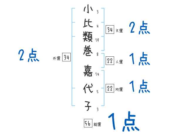 人運![]() | 小比類巻嘉代子さんの人運は22画の1つ星!努力することが苦手ないっぽう手先が器用。芸術性にも優れる。 性格や才能などを表す2番目に重要な運勢です。人間関係や協調性、社会的な成功に影響します。主に20歳から50歳ぐらいまでの中年期の運勢を表します。 |