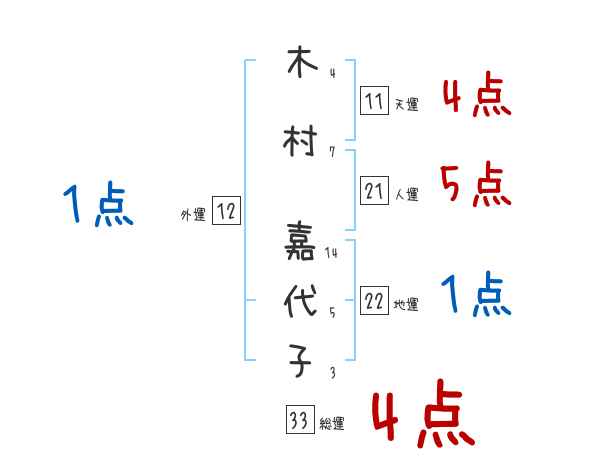 天運![]() | 木村嘉代子さんの天運は11画の4つ星!着実に富や地位を得る幸運な人生。 家系が持つ宿命的な運勢を表します。祖先から受け継いだ苗字ですので自分の力が及びません。家柄を象徴します。 |
