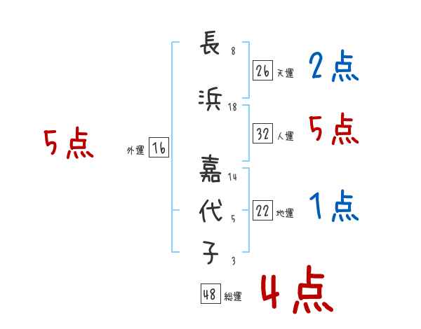 | 人運  | 長浜嘉代子さんの人運は32画の5つ星!柔軟性があり成功する。チャンスが多く金運が良い。性格や才能などを表す2番目に重要な運勢です。人間関係や協調性、社会的な成功に影響します。主に20歳から50歳ぐらいまでの中年期の運勢を表します。 |