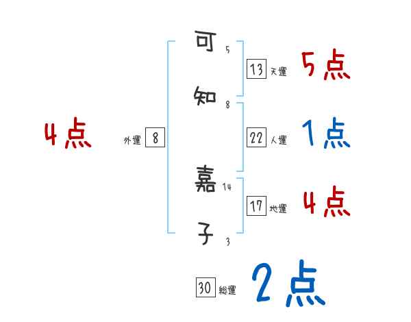 総運![]() | 可知嘉子さんの総運は30画の2つ星!浮き沈みの激しさに注意しましょう。 あなたの人生を表す1番重要な運勢です。生涯を通じて影響する総合運となり、主に50歳以降の晩年期に影響を及ぼします。 |