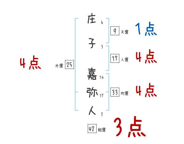 天運![]() | 庄子嘉弥人さんの天運は9画の1つ星!消極的で才能を発揮することが苦手なことも。周りの意見に耳を傾けましょう。 家系が持つ宿命的な運勢を表します。祖先から受け継いだ苗字ですので自分の力が及びません。家柄を象徴します。 |