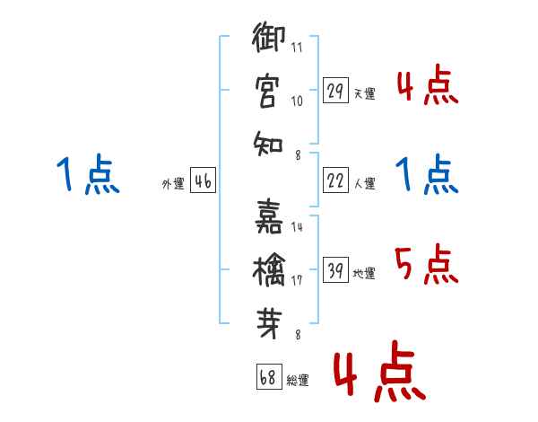 天運![]() | 御宮知嘉檎芽さんの天運は29画の4つ星!完全主義で才能がある。厳格な心の持ち主。 家系が持つ宿命的な運勢を表します。祖先から受け継いだ苗字ですので自分の力が及びません。家柄を象徴します。 |