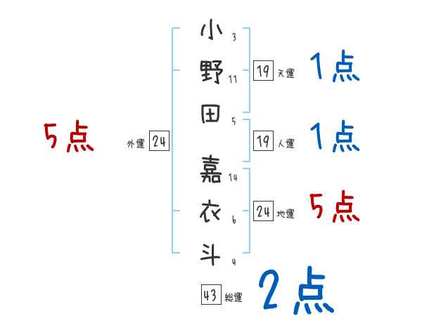 外運![]() | 小野田嘉衣斗さんの外運は24画の5つ星!家庭運が良く順調な人生。金運にも恵まれる。 生活面を象徴する運勢です。外部から受ける影響力を表し、結婚運、家庭運や職場、環境への順応性を表します。 |
