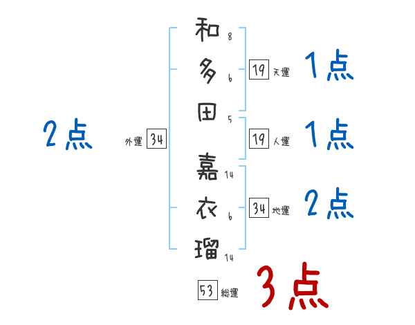 総運![]() | 和多田嘉衣瑠さんの総運は53画の3つ星!やや見栄っ張りで虚栄心がある。散財に注意。 あなたの人生を表す1番重要な運勢です。生涯を通じて影響する総合運となり、主に50歳以降の晩年期に影響を及ぼします。 |