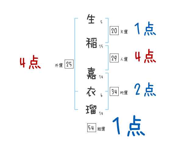 総運![]() | 生稲嘉衣瑠さんの総運は54画の1つ星!トラブルが多いかも。周りをよく見て協調して過ごしましょう。 あなたの人生を表す1番重要な運勢です。生涯を通じて影響する総合運となり、主に50歳以降の晩年期に影響を及ぼします。 |