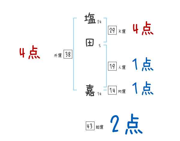 総運![]() | 塩田嘉さんの総運は43画の2つ星!頑固な性格で独立心が強いかも。やや非現実的で浪費に注意しましょう。 あなたの人生を表す1番重要な運勢です。生涯を通じて影響する総合運となり、主に50歳以降の晩年期に影響を及ぼします。 |