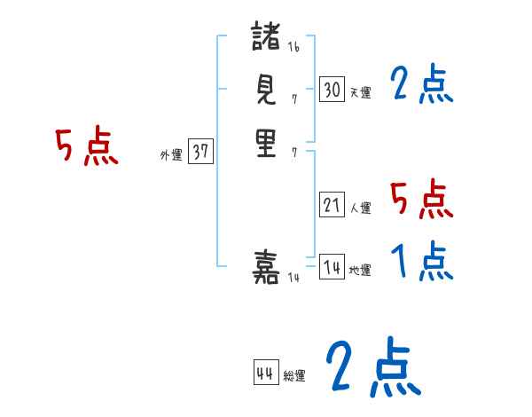 天運![]() | 諸見里嘉さんの天運は30画の2つ星!浮き沈みの激しさに注意しましょう。 家系が持つ宿命的な運勢を表します。祖先から受け継いだ苗字ですので自分の力が及びません。家柄を象徴します。 |