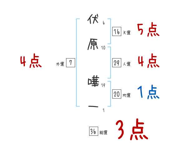 総運![]() | 伏原嘩一さんの総運は36画の3つ星!先見性が豊かです。多少神経質で苦労することも。 あなたの人生を表す1番重要な運勢です。生涯を通じて影響する総合運となり、主に50歳以降の晩年期に影響を及ぼします。 |