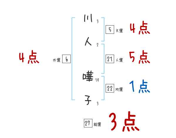 天運![]() | 川人嘩子さんの天運は5画の4つ星!健康で安泰。協調性に優れ、財産に恵まれる。 家系が持つ宿命的な運勢を表します。祖先から受け継いだ苗字ですので自分の力が及びません。家柄を象徴します。 |