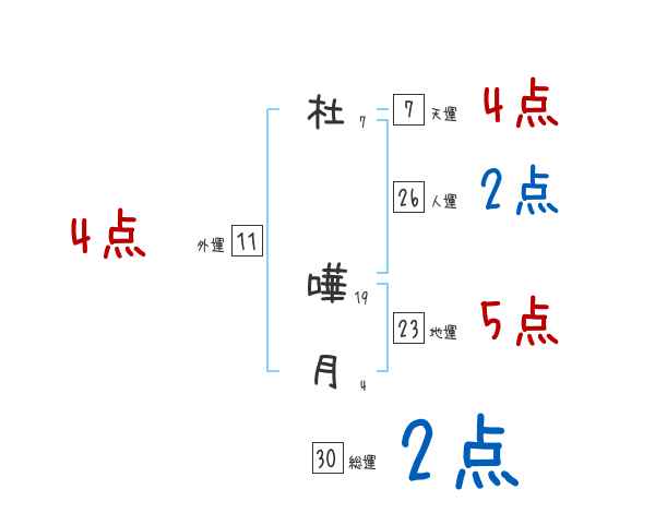 天運![]() | 杜嘩月さんの天運は7画の4つ星!強い意志や信念を持ち独立心が強い。自立する。 家系が持つ宿命的な運勢を表します。祖先から受け継いだ苗字ですので自分の力が及びません。家柄を象徴します。 |