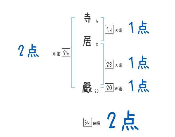 天運![]() | 寺居嚴さんの天運は14画の1つ星!人に対して優しいがストレスを溜め込みがち。人間関係のトラブルを避けるよう気をつけましょう。 家系が持つ宿命的な運勢を表します。祖先から受け継いだ苗字ですので自分の力が及びません。家柄を象徴します。 |