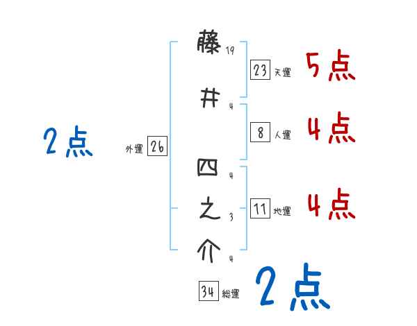 天運![]() | 藤井四之介さんの天運は23画の5つ星!想像力に優れ活力がある。一代で成功し名誉を手に入れる。 家系が持つ宿命的な運勢を表します。祖先から受け継いだ苗字ですので自分の力が及びません。家柄を象徴します。 |