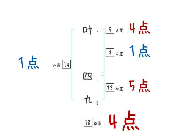 外運![]() | 叶四九さんの外運は14画の1つ星!人に対して優しいがストレスを溜め込みがち。人間関係のトラブルを避けるよう気をつけましょう。 生活面を象徴する運勢です。外部から受ける影響力を表し、結婚運、家庭運や職場、環境への順応性を表します。 |