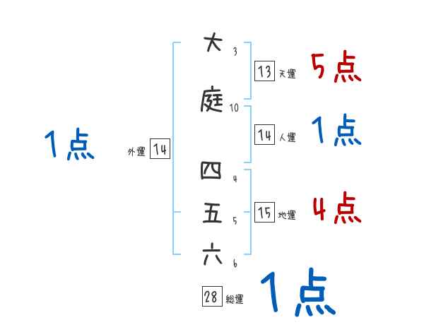 天運![]() | 大庭四五六さんの天運は13画の5つ星!才能に恵まれ人気がある。名声を手に入れる。円満な人生。 家系が持つ宿命的な運勢を表します。祖先から受け継いだ苗字ですので自分の力が及びません。家柄を象徴します。 |