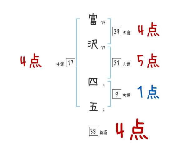 人運![]() | 富沢四五さんの人運は21画の5つ星!統率力がある。独立し成功する。名誉を手に入れる。 性格や才能などを表す2番目に重要な運勢です。人間関係や協調性、社会的な成功に影響します。主に20歳から50歳ぐらいまでの中年期の運勢を表します。 |