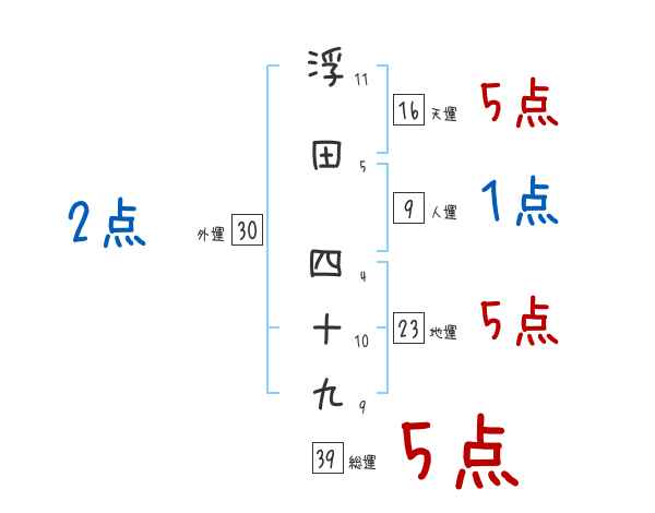総運![]() | 浮田四十九さんの総運は39画の5つ星!社交性に優れ人望が厚い。人の上に立ち成功する。 あなたの人生を表す1番重要な運勢です。生涯を通じて影響する総合運となり、主に50歳以降の晩年期に影響を及ぼします。 |