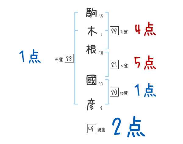 外運![]() | 駒木根國彦さんの外運は28画の1つ星!家庭環境に注意。スポーツで活躍できる能力があるかも。 生活面を象徴する運勢です。外部から受ける影響力を表し、結婚運、家庭運や職場、環境への順応性を表します。 |