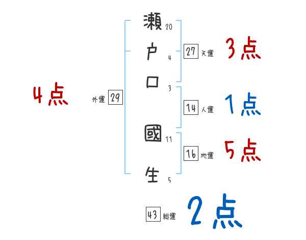 天運![]()  | 瀬戸口國生さんの天運は27画の3つ星!頭脳明晰だが強情で摩擦が多い傾向。孤立に注意。 家系が持つ宿命的な運勢を表します。祖先から受け継いだ苗字ですので自分の力が及びません。家柄を象徴します。 |