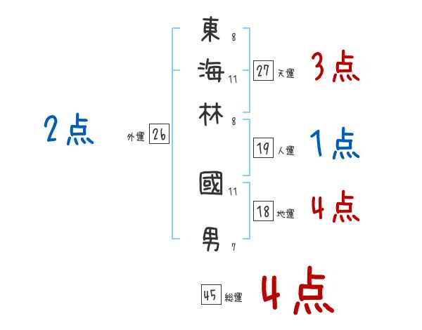 外運![]() | 東海林國男さんの外運は26画の2つ星!波瀾万丈かも。信頼できる人を大事にしましょう。 生活面を象徴する運勢です。外部から受ける影響力を表し、結婚運、家庭運や職場、環境への順応性を表します。 |