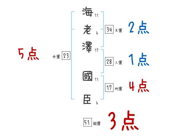 総運![]() | 海老澤國臣さんの総運は51画の3つ星!変化が激しく、危険に注意。堅実な性格。 あなたの人生を表す1番重要な運勢です。生涯を通じて影響する総合運となり、主に50歳以降の晩年期に影響を及ぼします。 |