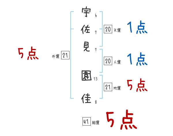 外運![]() | 宇佐見園佳さんの外運は21画の5つ星!統率力がある。独立し成功する。名誉を手に入れる。 生活面を象徴する運勢です。外部から受ける影響力を表し、結婚運、家庭運や職場、環境への順応性を表します。 |