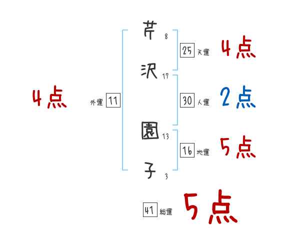 天運![]() | 芹沢園子さんの天運は25画の4つ星!個性があり才能があふれる。強運の持ち主で発展する。 家系が持つ宿命的な運勢を表します。祖先から受け継いだ苗字ですので自分の力が及びません。家柄を象徴します。 |