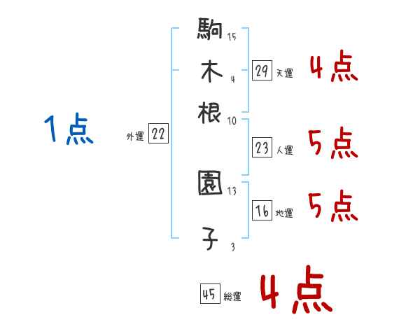 天運![]() | 駒木根園子さんの天運は29画の4つ星!完全主義で才能がある。厳格な心の持ち主。 家系が持つ宿命的な運勢を表します。祖先から受け継いだ苗字ですので自分の力が及びません。家柄を象徴します。 |