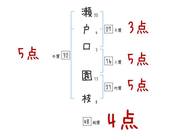 外運![]() | 瀬戸口園枝さんの外運は32画の5つ星!柔軟性があり成功する。チャンスが多く金運が良い。 生活面を象徴する運勢です。外部から受ける影響力を表し、結婚運、家庭運や職場、環境への順応性を表します。 |
