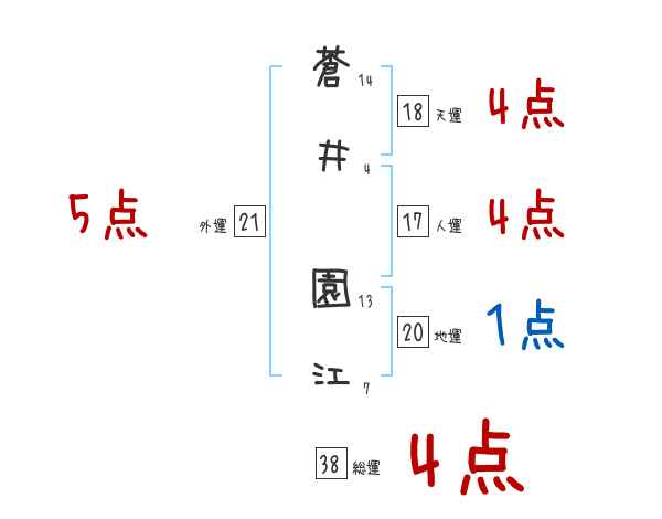 天運![]() | 蒼井園江さんの天運は18画の4つ星!情熱的で剛気。忍耐力があり信頼される。 家系が持つ宿命的な運勢を表します。祖先から受け継いだ苗字ですので自分の力が及びません。家柄を象徴します。 |