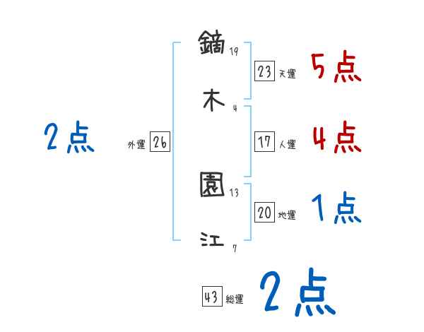 外運![]() | 鏑木園江さんの外運は26画の2つ星!波瀾万丈かも。信頼できる人を大事にしましょう。 生活面を象徴する運勢です。外部から受ける影響力を表し、結婚運、家庭運や職場、環境への順応性を表します。 |
