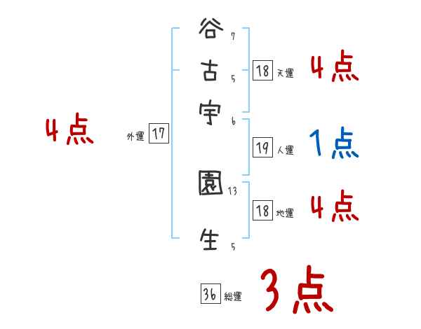 天運![]() | 谷古宇園生さんの天運は18画の4つ星!情熱的で剛気。忍耐力があり信頼される。 家系が持つ宿命的な運勢を表します。祖先から受け継いだ苗字ですので自分の力が及びません。家柄を象徴します。 |