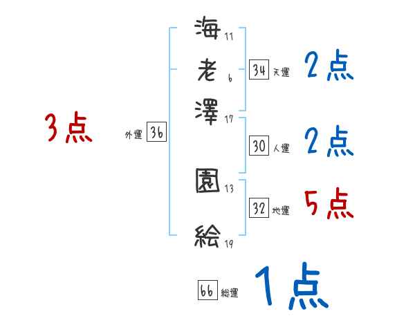 外運![]() | 海老澤園絵さんの外運は36画の3つ星!先見性が豊かです。多少神経質で苦労することも。 生活面を象徴する運勢です。外部から受ける影響力を表し、結婚運、家庭運や職場、環境への順応性を表します。 |